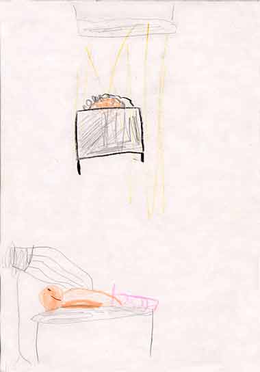 Dr. Stengel schaut gerade, was mit Katharinas Tropf los ist. Die Nadel ist kaputt, deshalg muß er einen neuen Tropf legen. Katharina kriegt ein Einhorn als Belohnung, weil sie nicht geschrieen hat. Schwester Gertrud tröstet sie danach, weil sie achtmal haben stechen müssen.